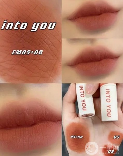如果你喜歡疊涂的話,INTOYOU EM05+EM08是一個不錯的選擇。EM05是裸杏色,適合深唇當(dāng)作日常打底色來用;而EM08陶土紅棕是一支經(jīng)典的熱門色,和很火的EM19很像,有點蜜豆沙色的感覺,黃皮和深色唇都能夠駕馭。